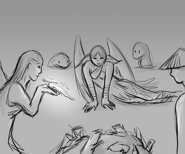 "THOSE LIGHT THINGS IN THE SKY." YOU SAY. "I KNOCKED ONE DOWN WHEN IT FLEW NEAR ME AND TRIED TO GRAB IT, BUT IT CUT UP MY HANDS AND GOT AWAY." THE GIRLS LOOK UP AT THE NUMEROUS LINES OF LIGHT DRAWN AGAINST BLACKNESS. "THOSE ARE MISN'GO." CHELLING SAYS. "A GOD-BEAST OF LORD PETRANOIA. LOOKS LIKE A SMALL SWARM TONIGHT." "A GOD-BEAST?" YOU SAY IN A QUIET VOICE, MINDFUL OF THE MOLEWORMS. "BUT IF THEY ARE HEADED IN THE DIRECTION OF THE GENETICS WAREHOUSE, DO YOU THINK...?" "WELL, IT'S TOO LATE TO DO ANYTHING ABOUT THAT NOW." CHELLING SAYS SO CARELESSLY THAT YOU ARE REASSURED. YOU TURN YOUR ATTENTION TO YOUR MANGLED HANDS, WHICH ARE HEALING BEFORE YOUR EYES. TORN SINEW AND ARTERIES BIND TOGETHER AND WRAP AROUND BONE, THEN ARE SHEATHED IN FLESH. "I USED TO BE A WHITE ANGEL HEALER DURING THE APOCALYPSE." DYMALKID SAYS. "ALTHOUGH I'M NOT AS SKILLED AS I USED TO BE." "WHY NOT?" YOU ASK. "BECAUSE I AM NOW A DARK ANGEL." SHE SAYS. YOU WAIT FOR AN EXPLANATION. "OH, YOU DON'T KNOW?" DYMALKID SAYS. "WHEN ANGELS TURN DARK FROM WHITE, SOME OF THEIR ABILITIES GROW WEAKER AND SOME ARE ENHANCED. OUR WINGS AND HAIR STAIN AND WE LOSE MUCH OF OUR INHERENT HEALING AND MUSICAL ABILITY. BUT WE CAN CONSUME MORE TYPES OF YILIXA AND WE CAN FEEL MORE EMOTIONS." "HOW DID YOU BECOME A DARK ANGEL?" YOU ASK. DYMALKID GIVES YOUR HAND A SQUEEZE. "YOU'RE DONE." SHE SAYS. "NOW GO BACK TO SLEEP." YOU CLOSE YOUR HAND IN A FIST AND FEEL HOW STIFF IT IS, BUT YOU THINK IT WILL RETURN TO NORMAL SOON. >