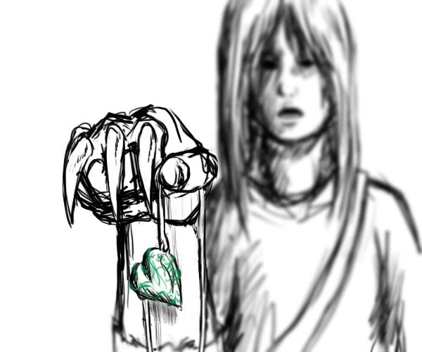 "THIS," YOU TAKE OUT YOUR LOCKET AND HOLD IT BY THE STRINGS. "IS WHAT HOLDS MY OTHER FORM." THE VEINS ESCAPING THE INSIDE OF THE LOCKET COIL AROUND THE SILVERY ORIHALCON, GIVING OFF A FAINT GREEN GLOW. DYMALKID STANDS UP. "IS THAT CRYSTALIZED YILIXA?" SHE SAYS, LEANING IN FOR A CLOSER LOOK. "YES. DON'T TOUCH." THE DARK ANGEL LOOKS AT IT CURIOUSLY, TILTING HER HEAD FOR A DIFFERENT ANGLE. "GREEN IS LORD CERLIONESS'S COLOR. DID SHE MAKE THIS FOR YOU?" "YES. AND SHE PUT ME IN MY CURRENT BODY." "WHY IS YOUR CRYSTAL GROWING ROOTS?" "IT'S NO LONGER STABLE. I FOUND IT IN PIECES AFTER THE ATTACK ON MY HOME. NOW IT'S TRYING TO MAKE ME WHOLE AGAIN."